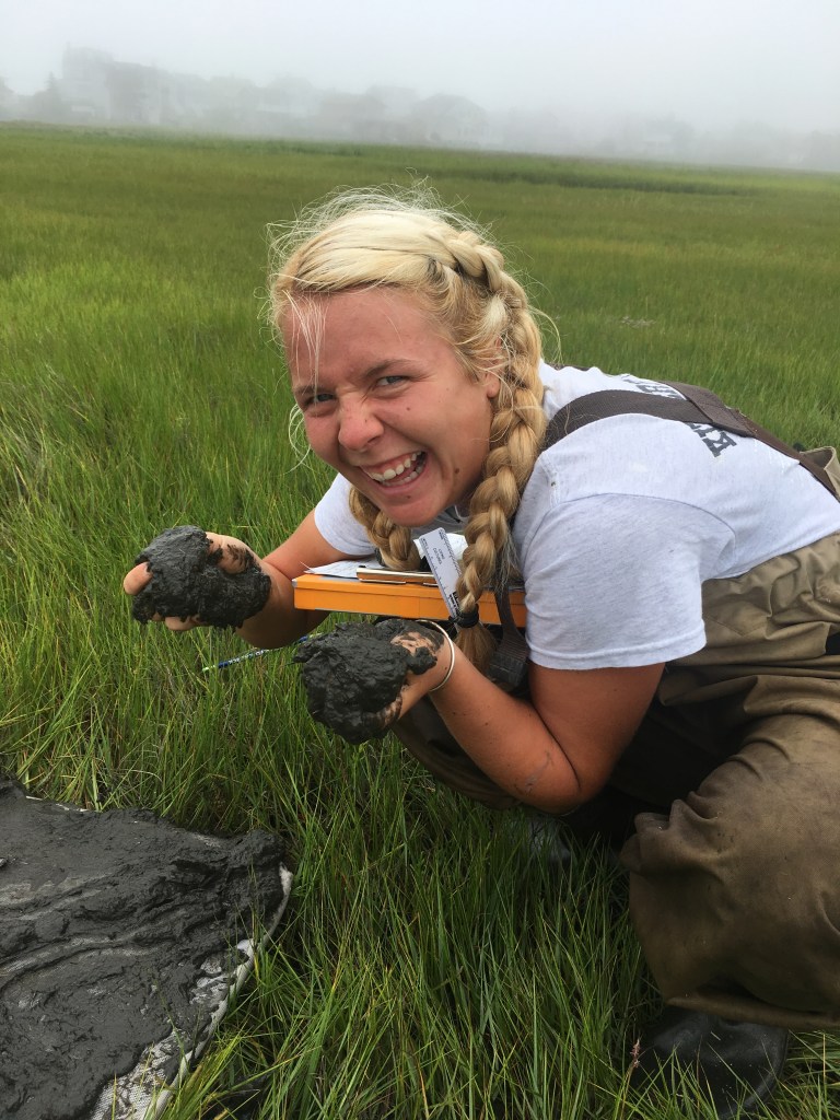 Closer to the edge, I am sure to inhale the subtle, yet pungent, smell of sulfur. Even stronger when the tide is out, the smell is caused by the slowly decaying organic material that comprises the spongy, nutrient-rich soil of salt marshes called peat. Because these soils so often experience hypoxic (low oxygen) conditions due to high tides, the bacteria that thrive in these conditions slowly turn dead organic matter into soil, creating hydrogen sulfide gas as a byproduct of decomposition!