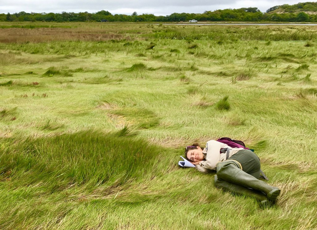 Salt marsh hay (Spartina patens) meadows produce smooth, flat mats that look like cowlicks in the high marsh platform. This is a specific part of the marsh that the tide regularly floods, but does not saturate the plant roots as thoroughly as those of the low marsh found closer to the banks of the tidal channel. These extensive hay mats are soft and comprised of thousands of thin, flexible stems that lay down flat in dry spots in the marsh, providing a perfect resting place for a hip wader-clad field technician like myself on a hot summer day─ possibly even dozing off for a quick nap.