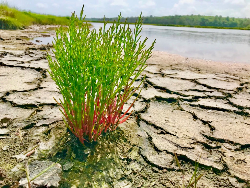 But the salt doesn’t stick to waterways (and my clothes) alone. It permeates certain salt marsh plants as well. If my mouth were ever parched while doing field work, I always know that if I needed to, I could pluck a small stem off common glasswort (Salicornia europaea), a succulent marsh plant. Also referred to as a pickle grass, the jointed stems are safe to consume and are crunchy and salty like the name suggests.