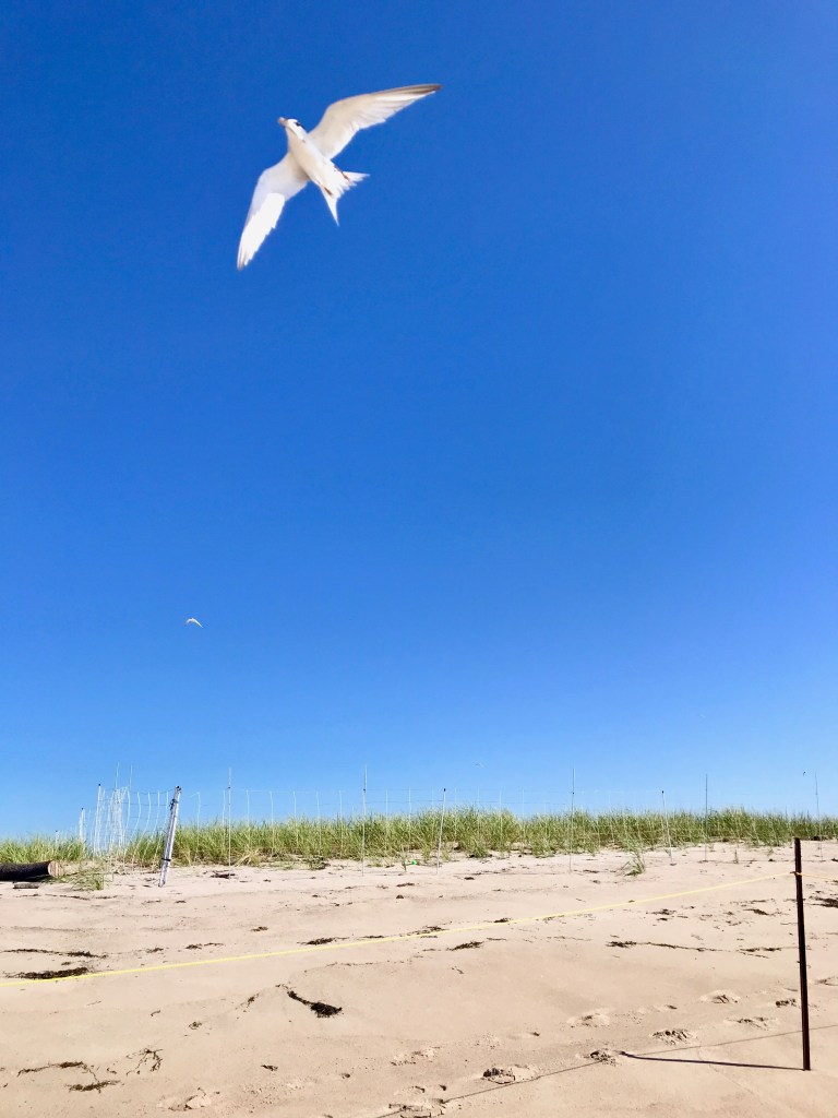 Over on the beach, commotion from a least tern (Sternula antillarum) colony masks the rhythmic sound of waves crashing on the shore. Above the high tide line in the dunes, up to 200 terns are noisily tending to their offspring. They retrieve meals from the ocean by hovering around 30 feet above the water and diving for small fish like hake and herring. If I stroll the beach during this time, the terns are also likely to dive for my head. They are aggressive parents and will do anything to ensure the survival of their chicks, which means my head may be deliberately pooped on as well. Beaches on the Refuge are a safe haven for the colony, but with threats from sea level rise, development, human disturbance, and predation, this cacophonous species is at risk.