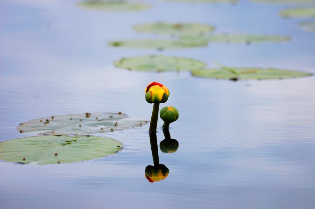 Aside from birds, our eyes were drawn to the many colorful flowering plants. My favorites, rhodora and cotton grass, make a whimsical confetti effect of pink and white amongst the vibrant greens of the tamaracks and leather leaf that surround them. This time of year, as spring unfolds, the yellow bulbs of water lilies are just starting to emerge from beneath the water, their bright color hinting at the beauty that will soon blossom across the surface of the bog.